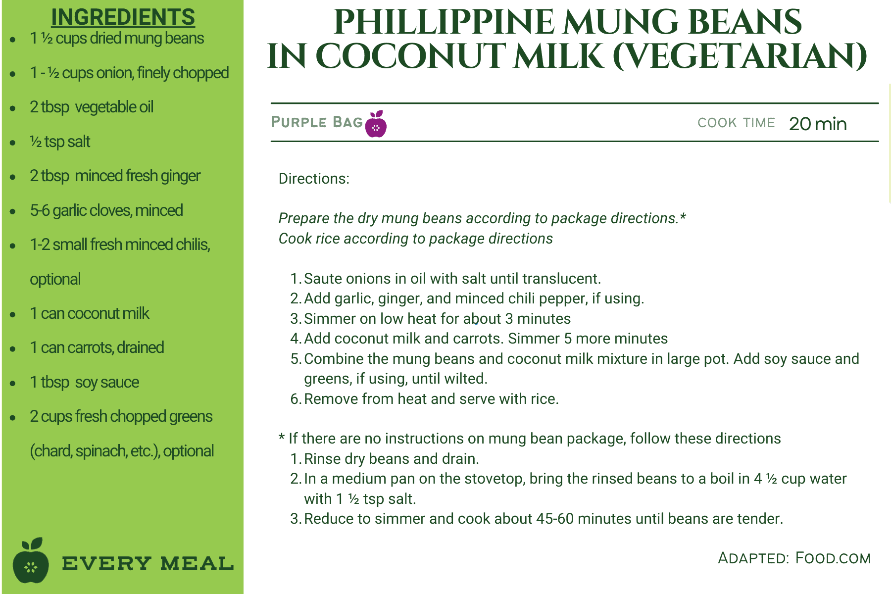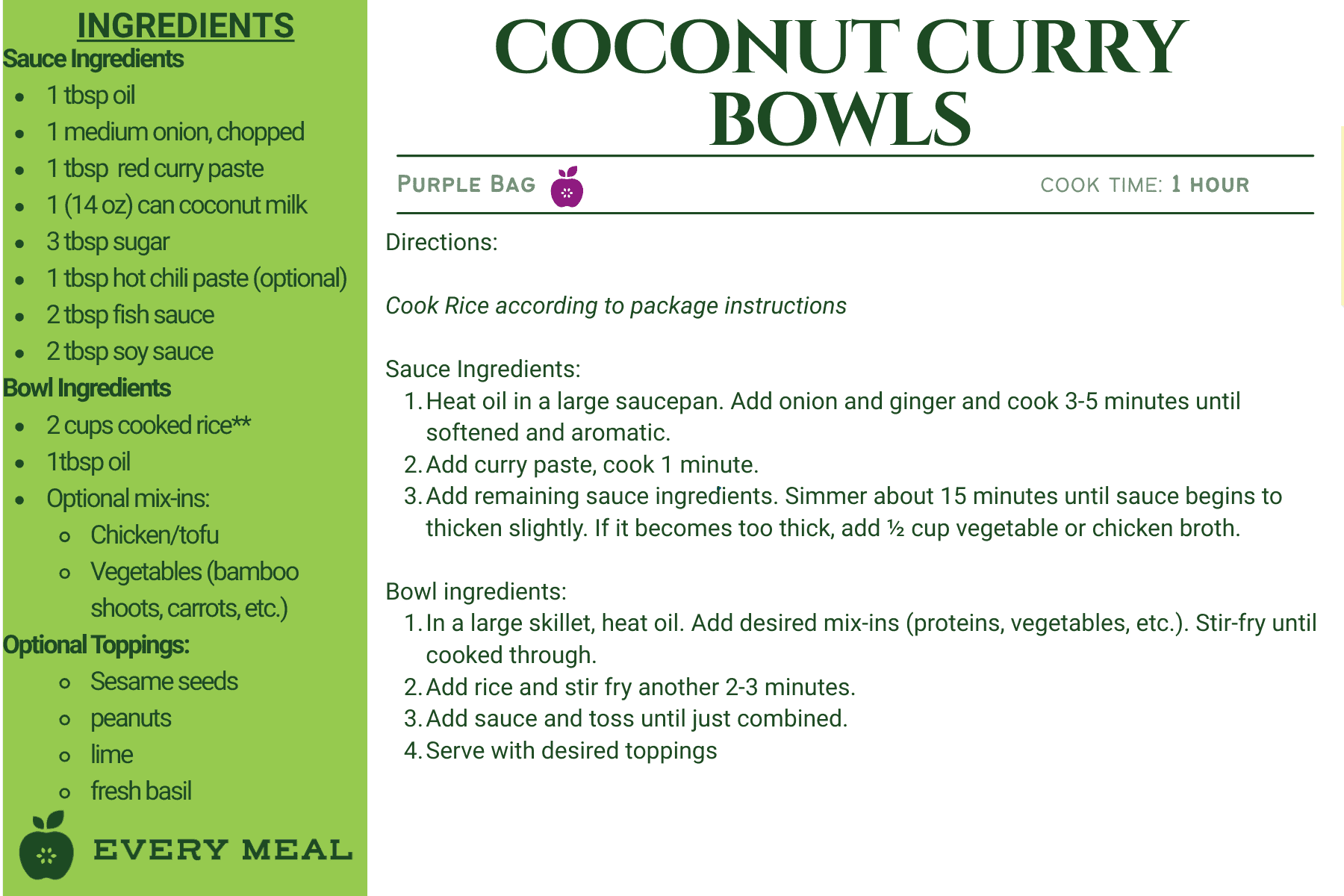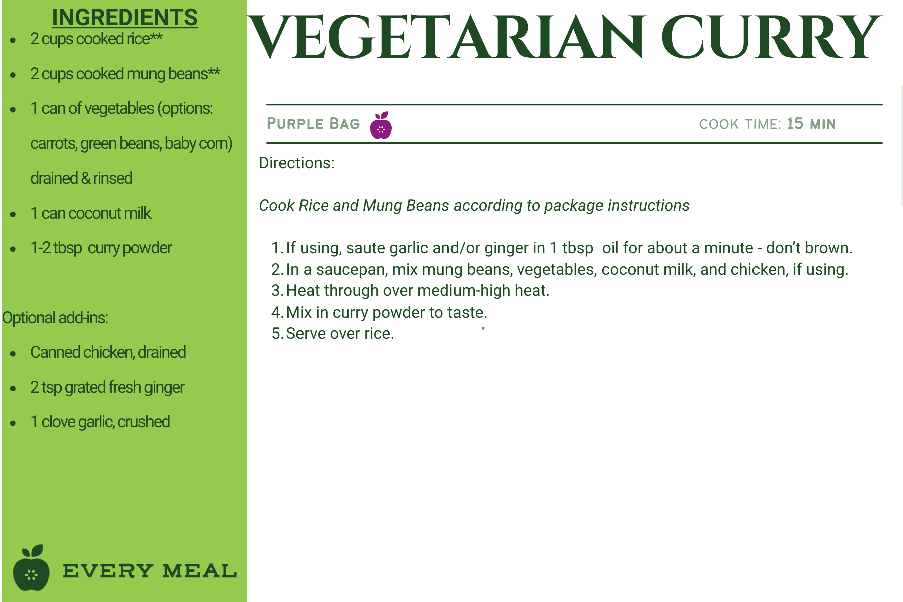 These recipes use ingredients from our purple bag, which are tailored for Southeast Asian dietary preferences. This meal bag may contain items such as rice, mung beans, coconut milk, bamboo shoots, curry paste, baby corn, and mandarin oranges.