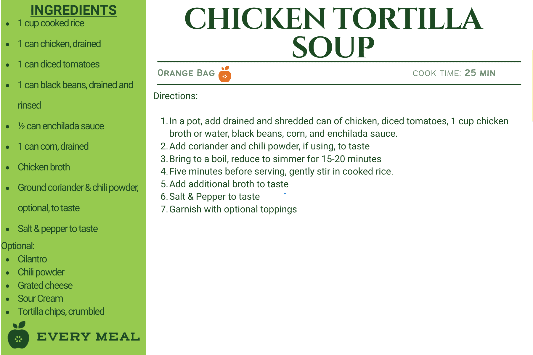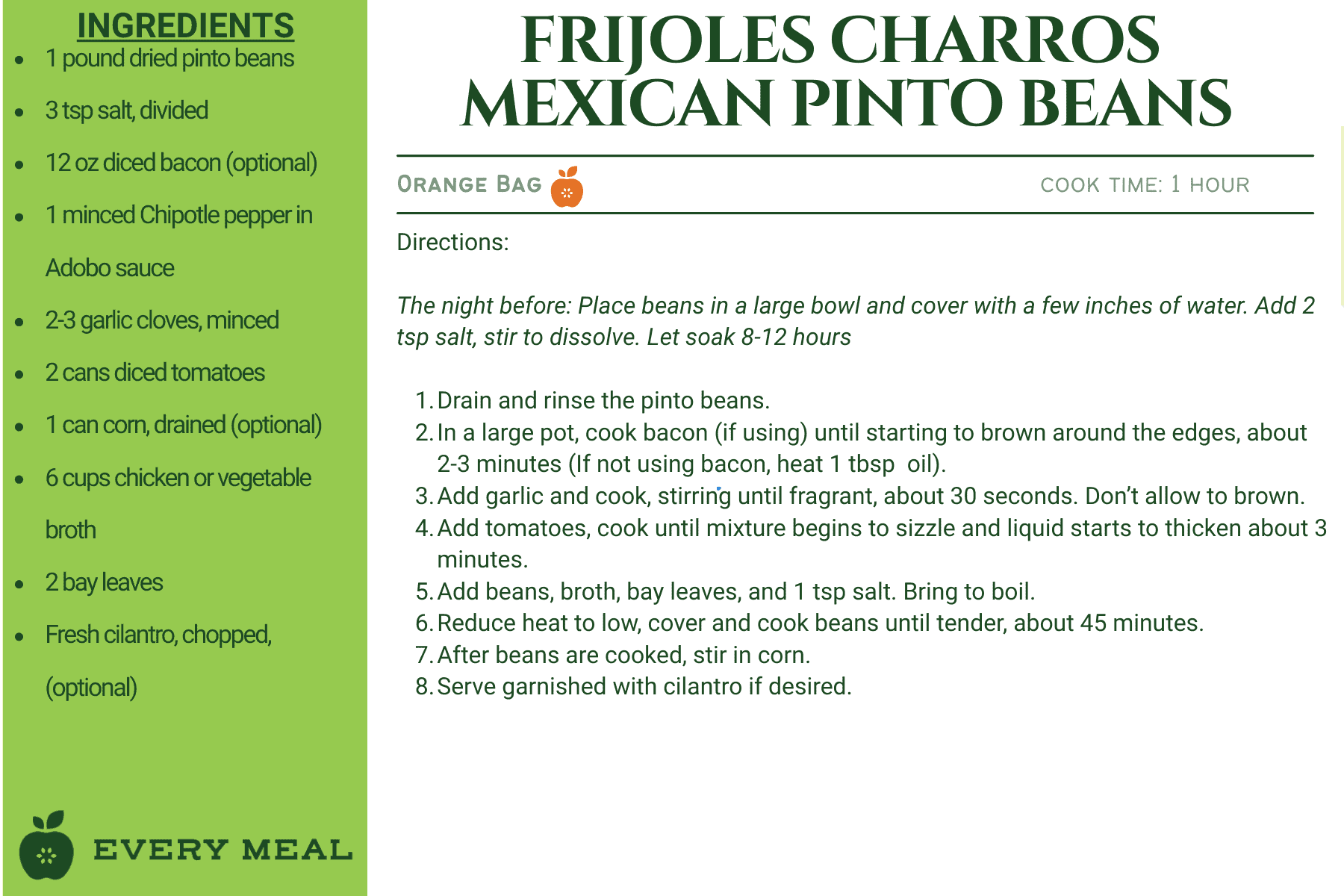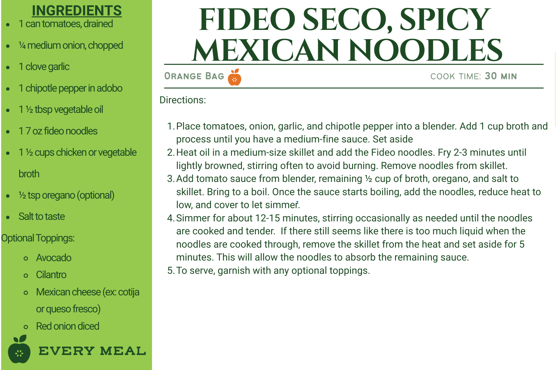 These recipes use ingredients from our orange bag, which are tailored for Latino dietary preferences. This meal bag may contain items such as rice, black beans, pinto beans, corn flour, fideo pasta, enchilada sauce, chipotles in adobo, and diced tomatoes.
