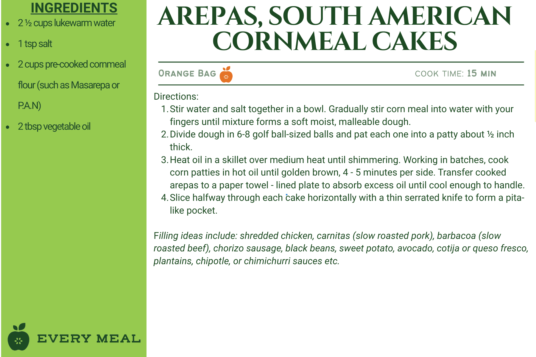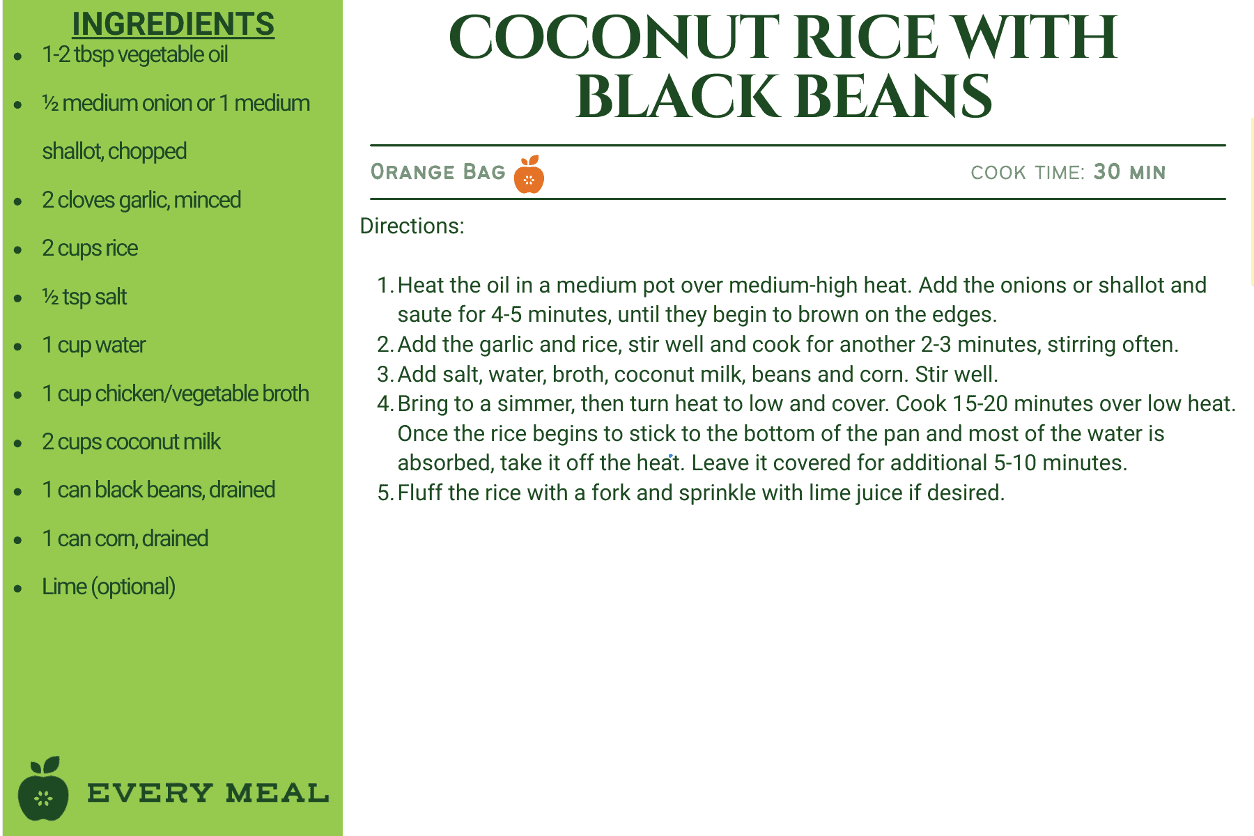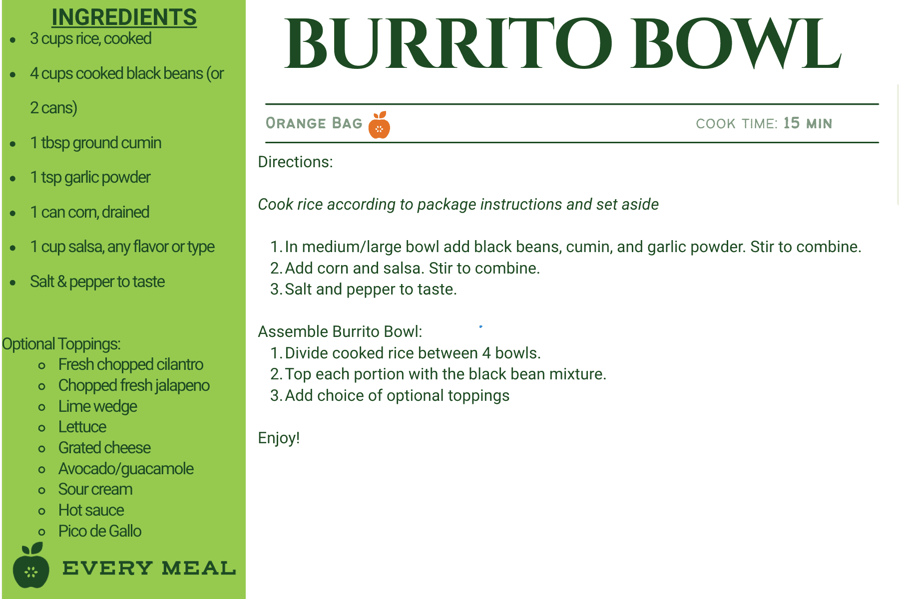 These recipes use ingredients from our orange bag, which are tailored for Latino dietary preferences. This meal bag may contain items such as rice, black beans, pinto beans, corn flour, fideo pasta, enchilada sauce, chipotles in adobo, and diced tomatoes.