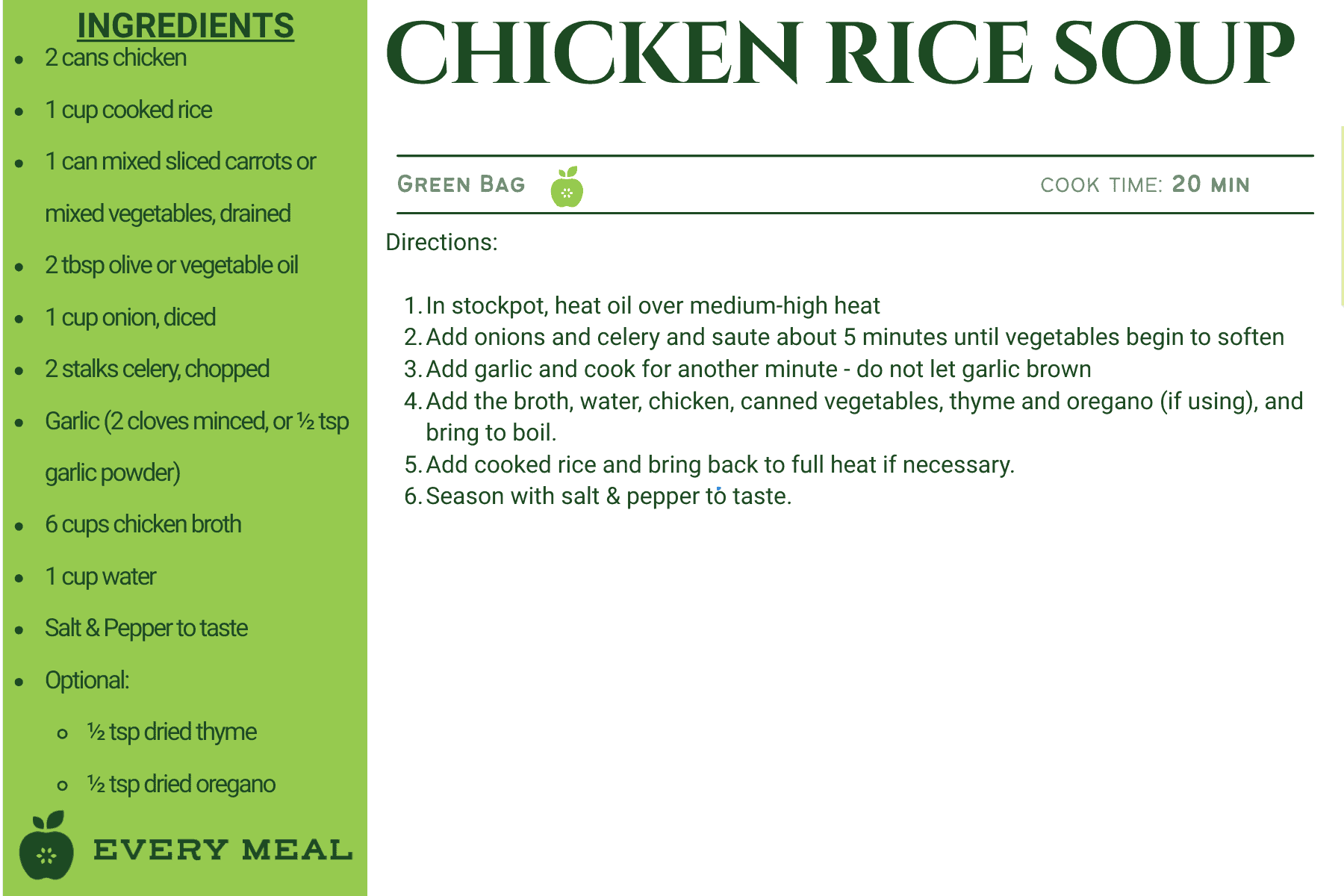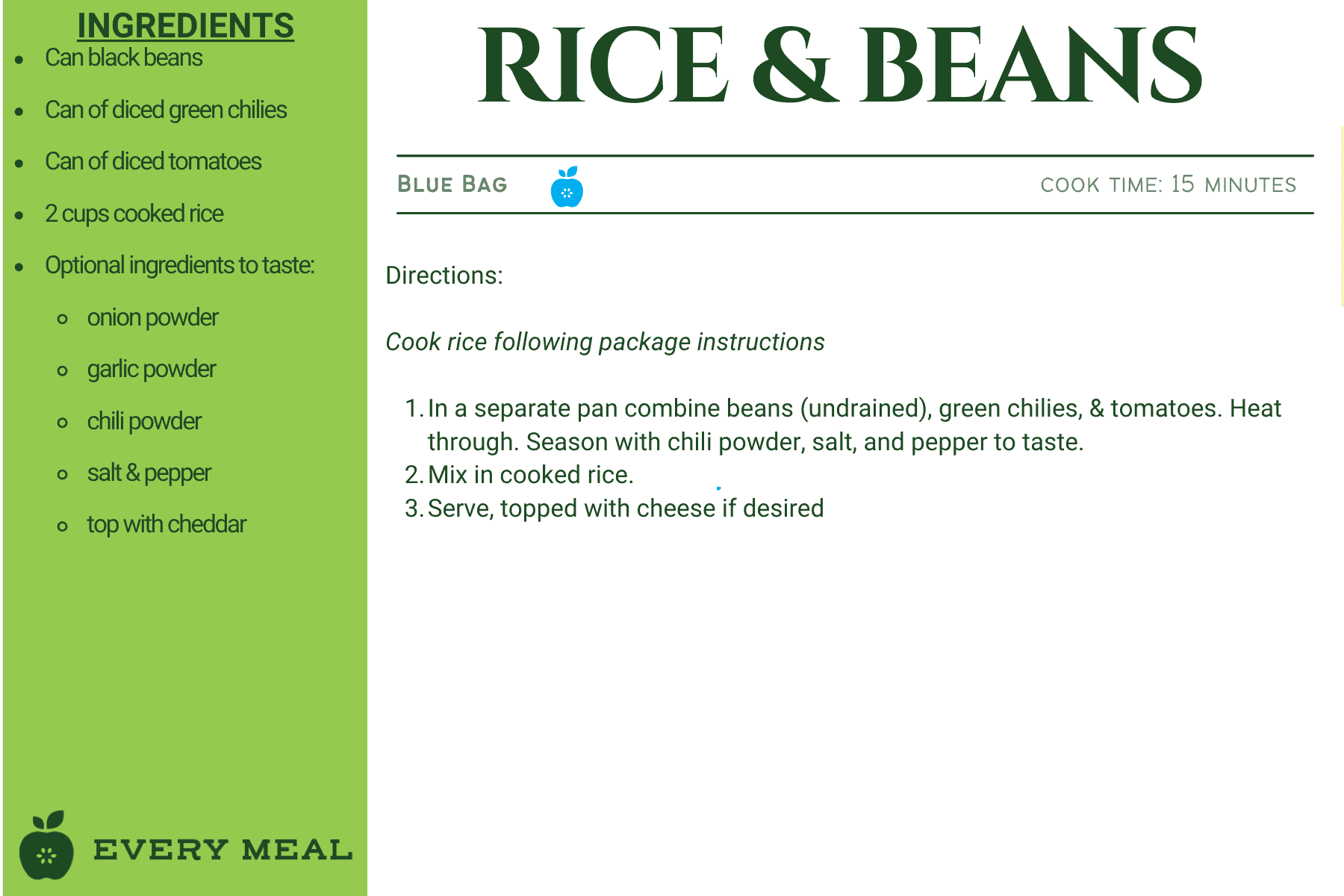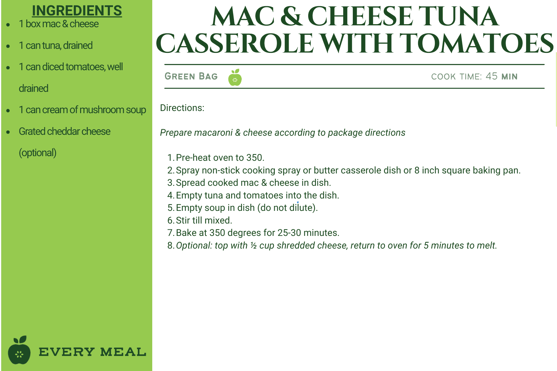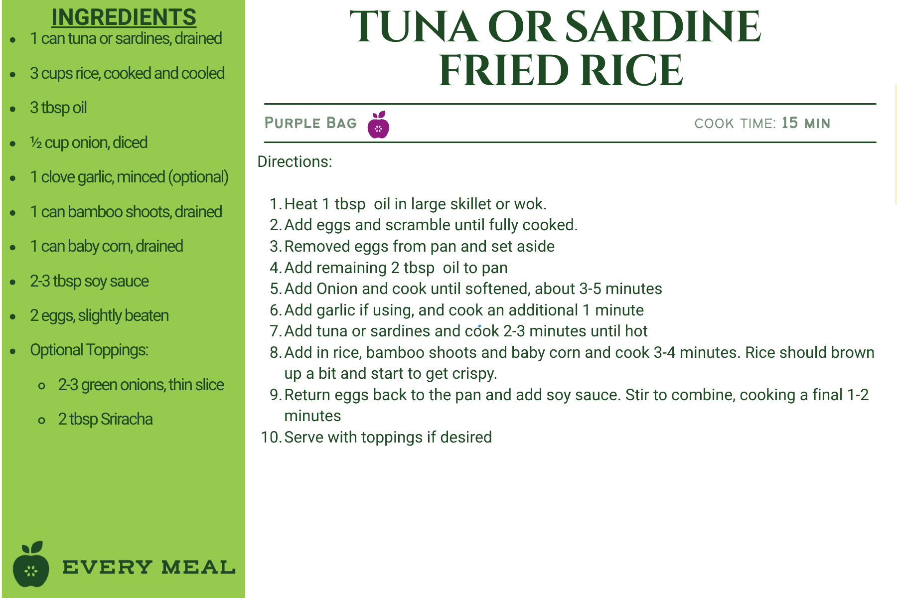 These recipes use ingredients from our green bag, which offers the widest variety of food items, such as chicken, tuna, pasta, rice, mac and cheese, soup, and varied vegetables and fruits.