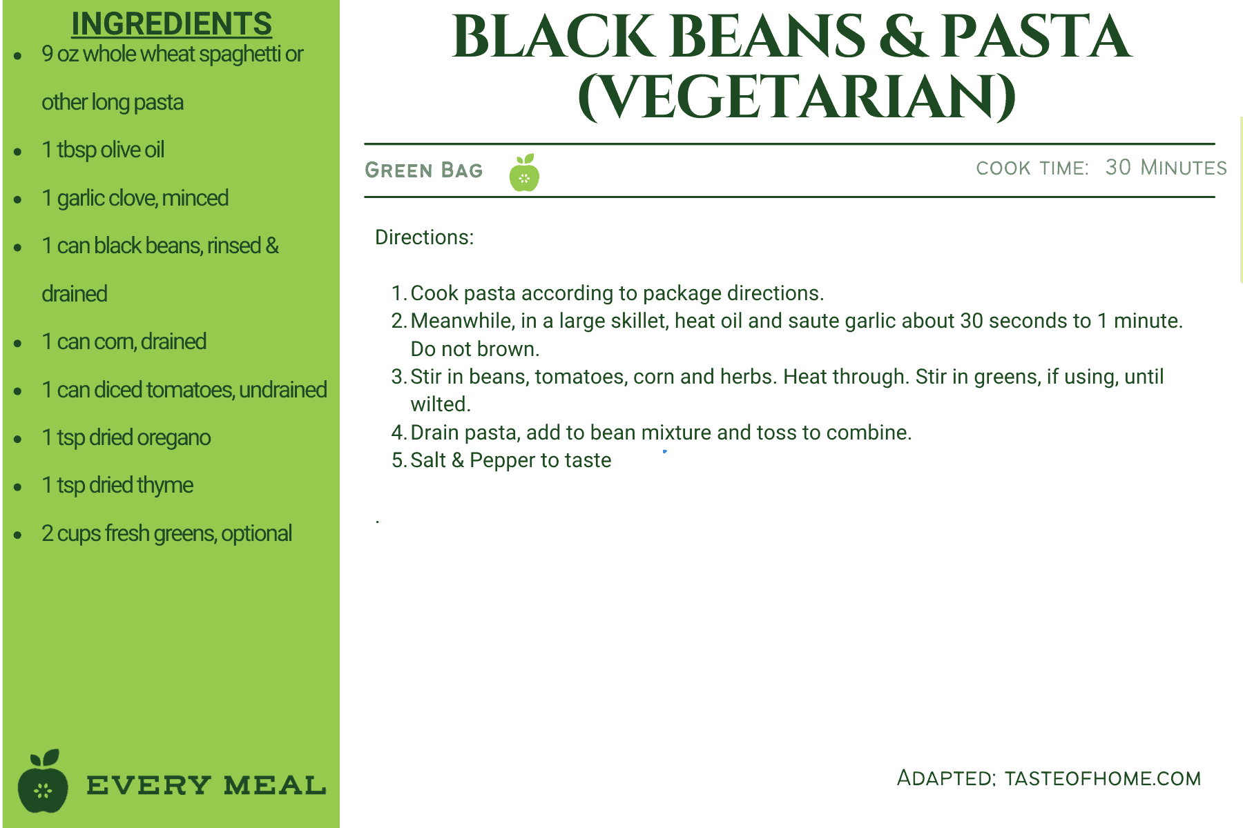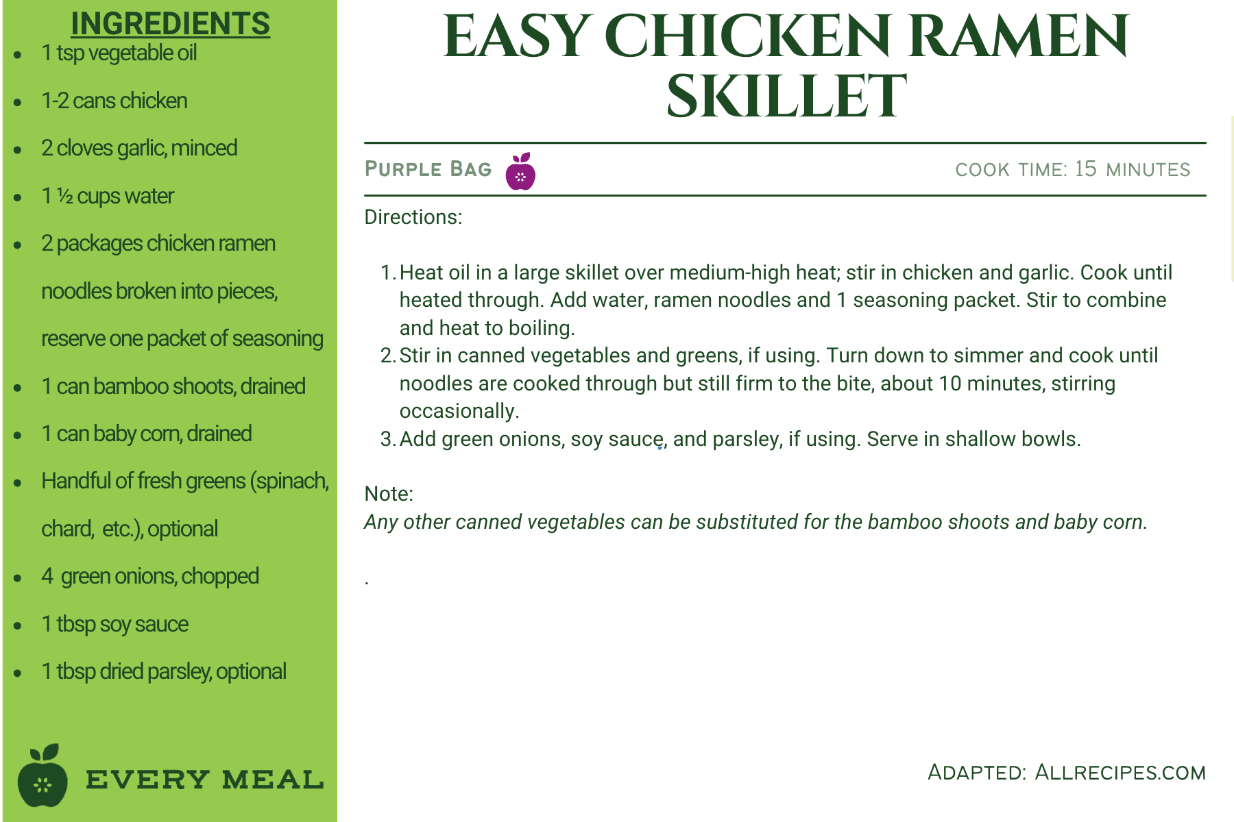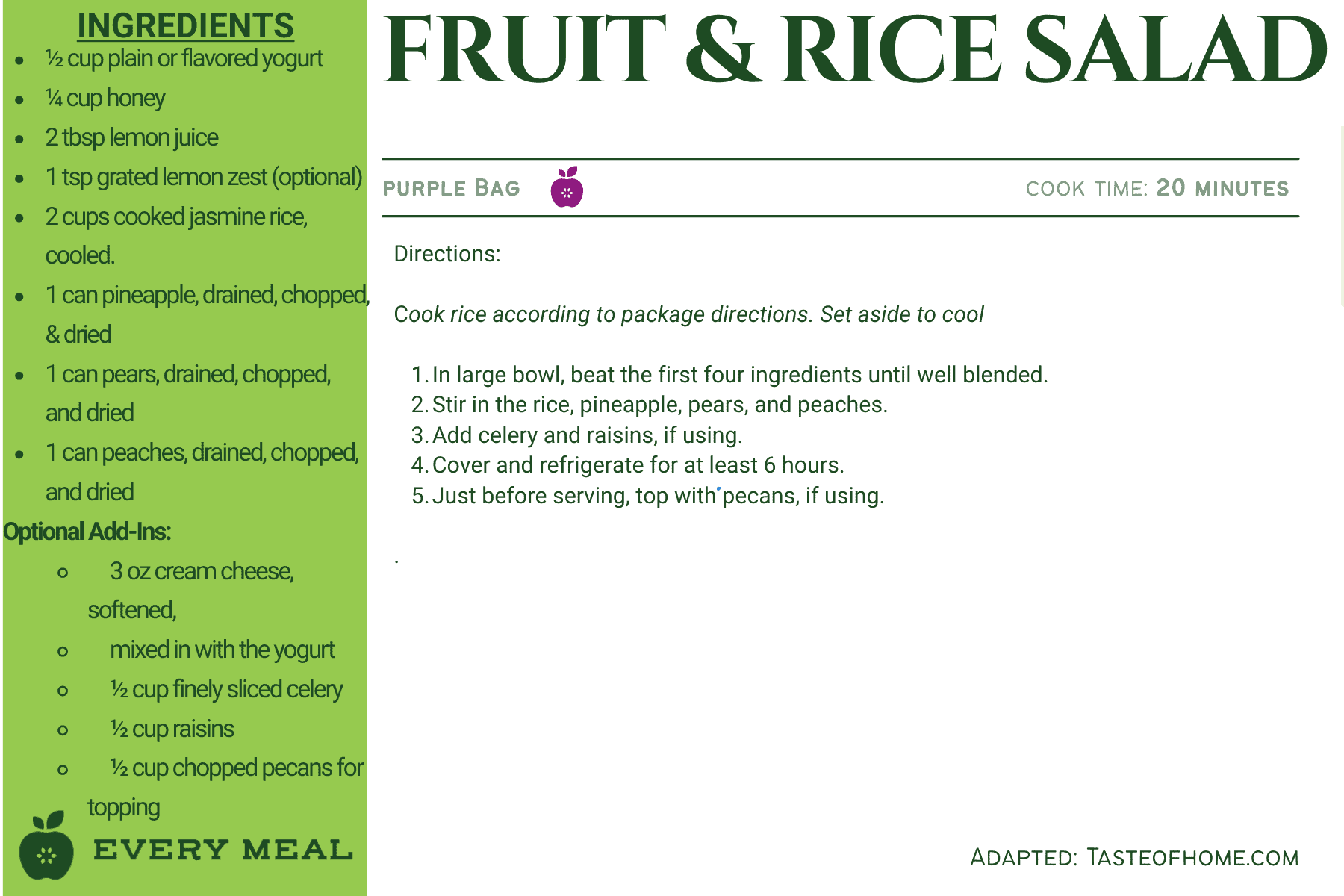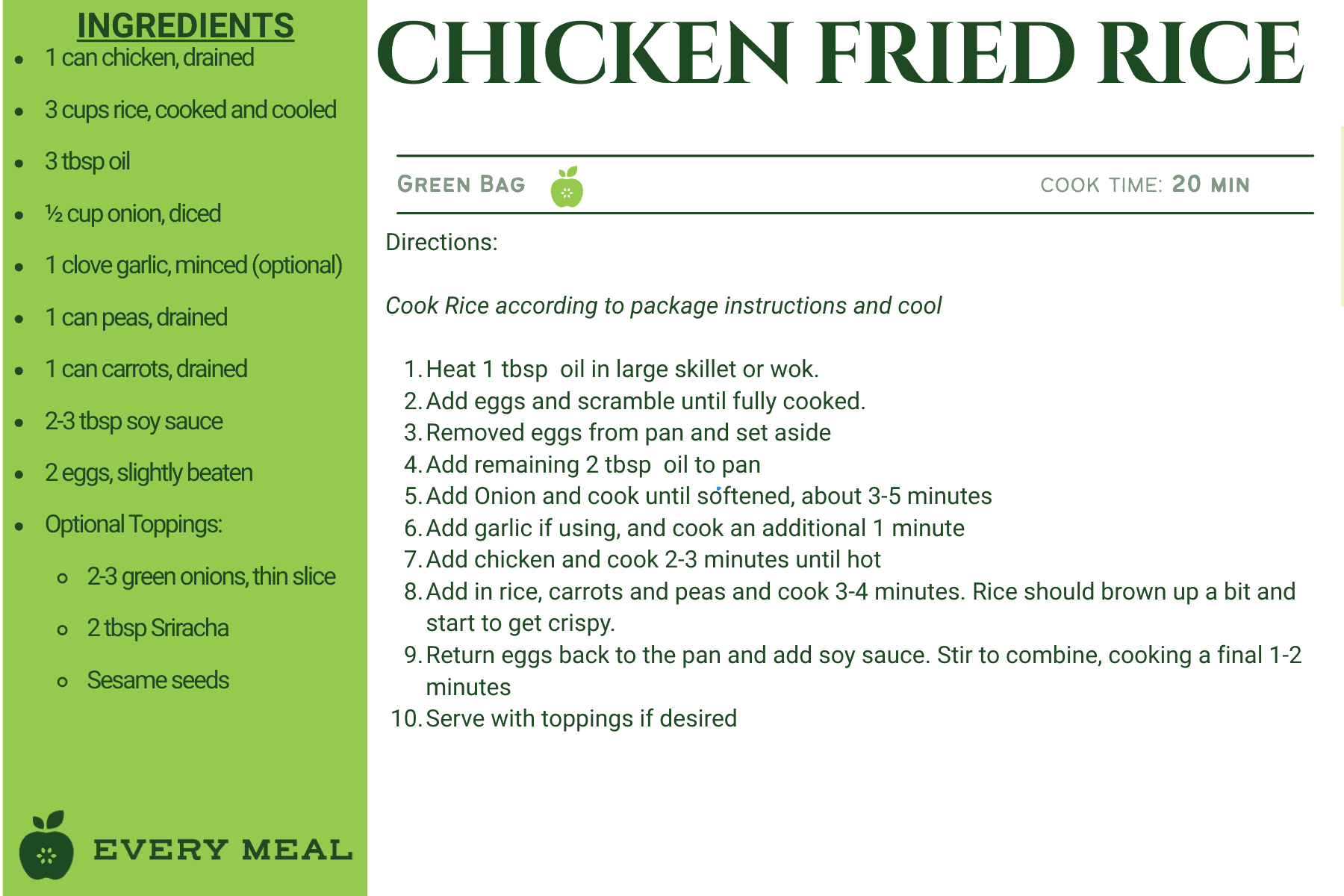 These recipes use ingredients from our green bag, which offers the widest variety of food items, such as chicken, tuna, pasta, rice, mac and cheese, soup, and varied vegetables and fruits.