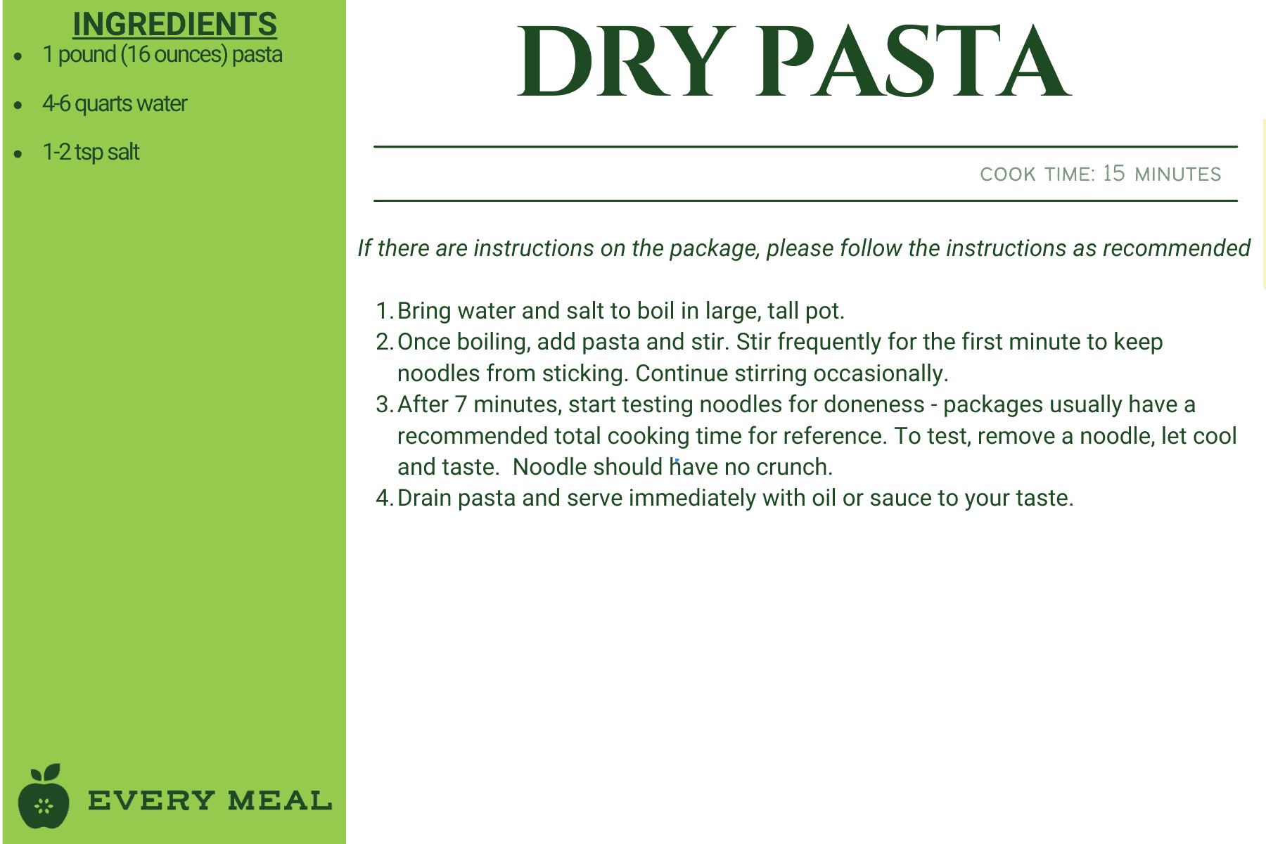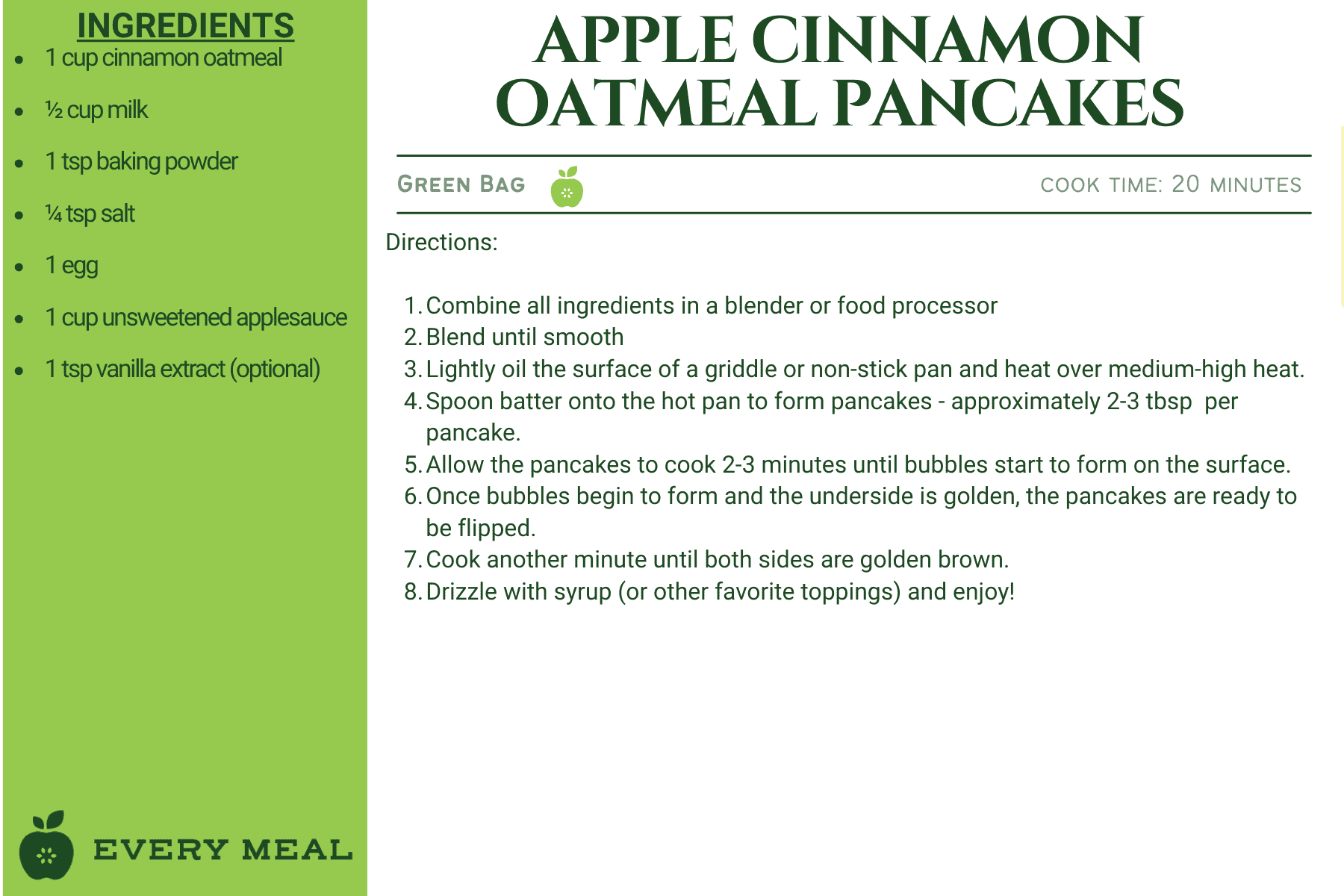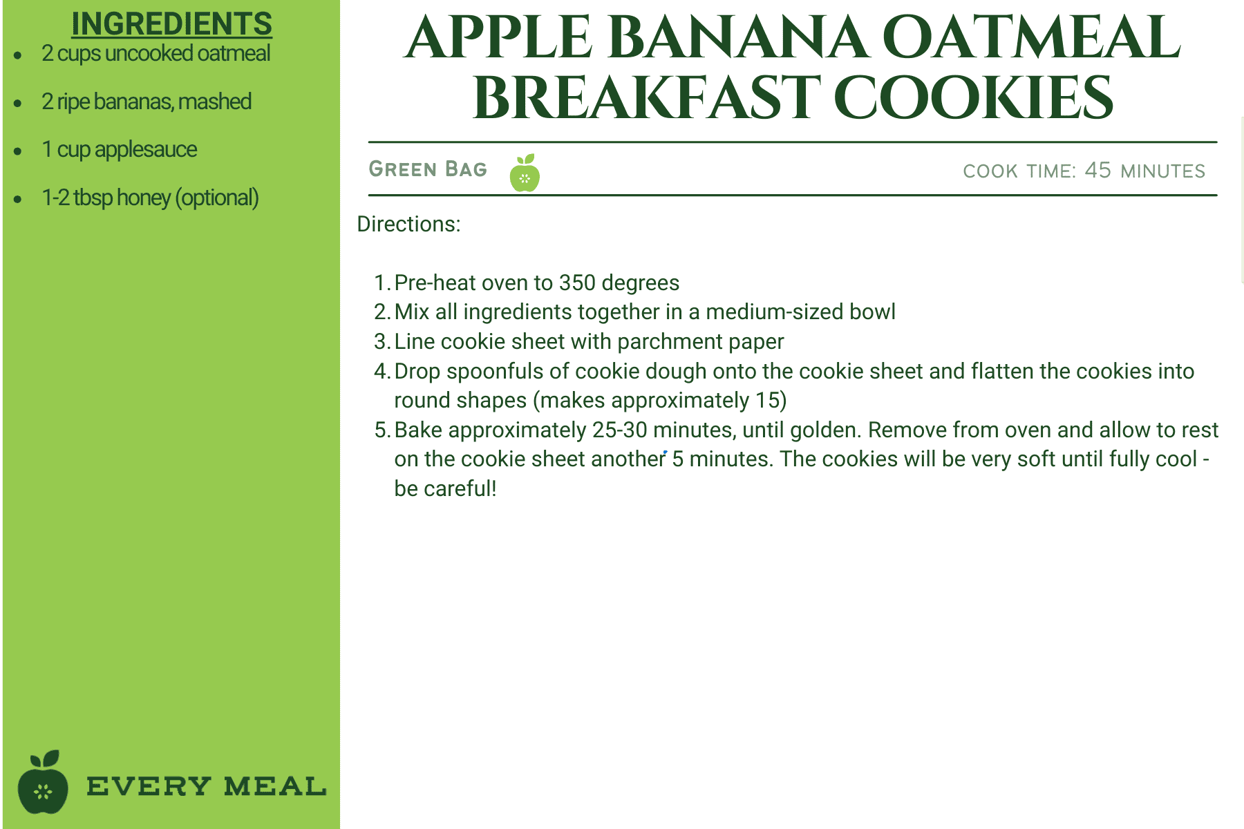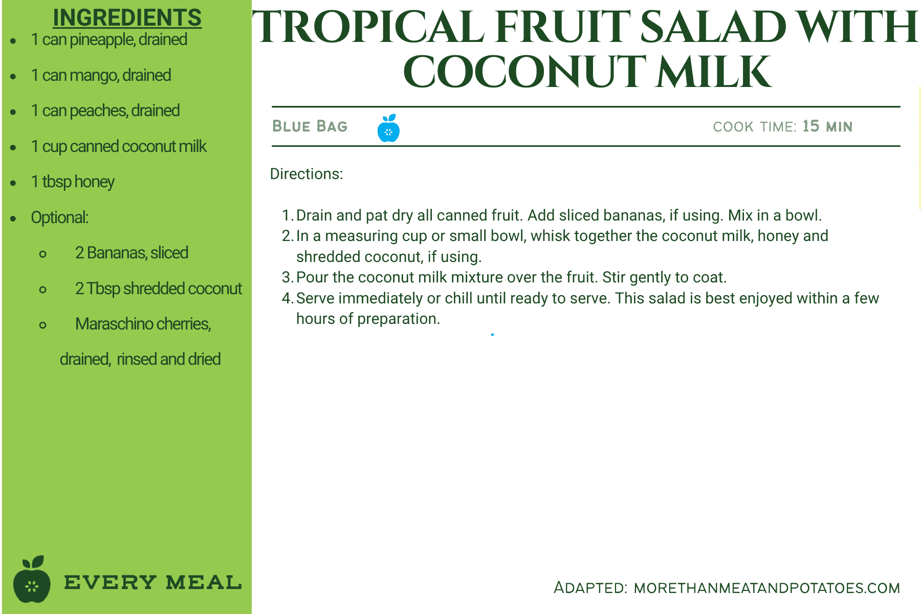 These recipes use ingredients from our green bag, which offers the widest variety of food items, such as chicken, tuna, pasta, rice, mac and cheese, soup, and varied vegetables and fruits.