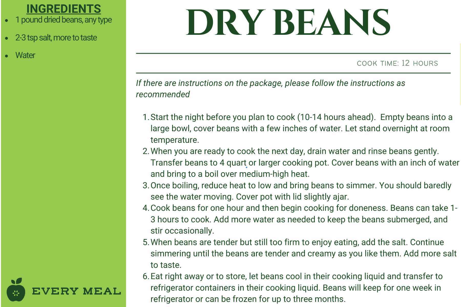 This meal bag is not designed to be built into a recipe as it contains all ready-to-eat items which require little or no preparation, such as dried fruit, chicken salad, sunflower seeds, granola, pasta cups, and soups.