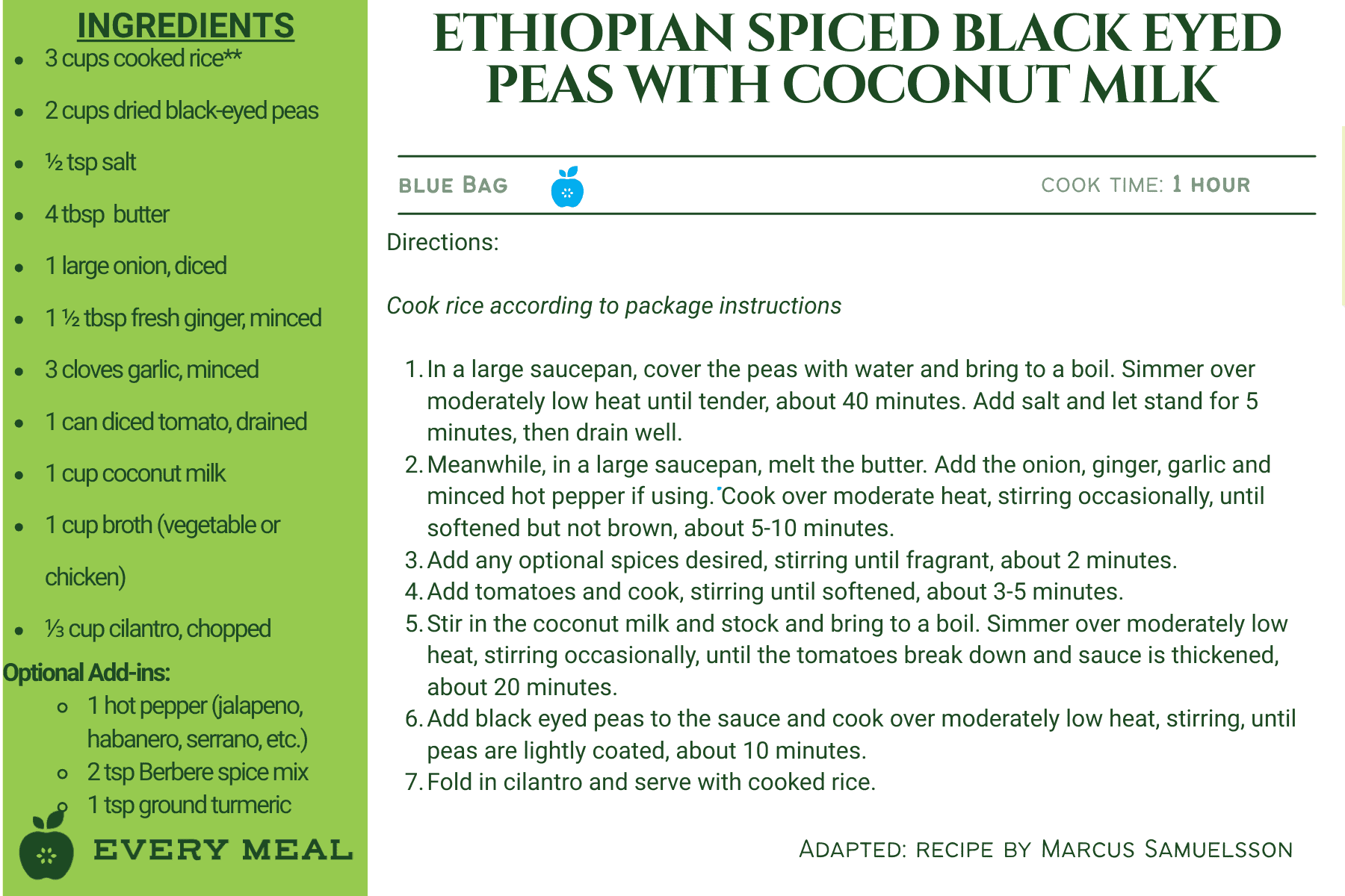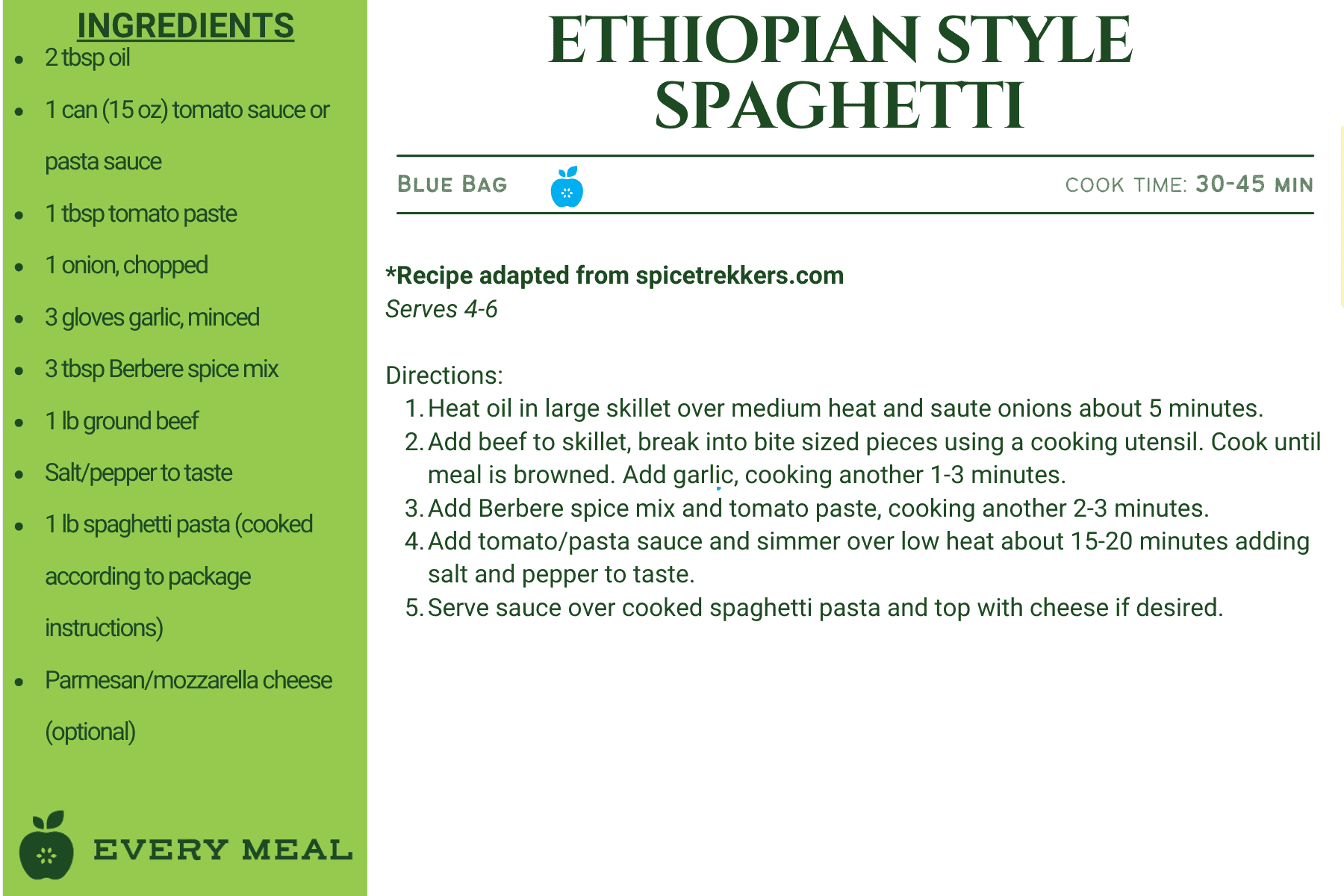 These recipes use ingredients from our blue bag, which is tailored for East African dietary preferences. This meal bag is pork-free and may contain items such as tuna, spaghetti, black-eyed peas, cornflour, and tomato products.